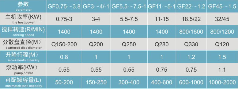 Extremely little air is absorbed during stirring and dispersing, therefore the mixing and even regulating result is excellent. The materials will be quickly dissolved with low granularity degree by stirring and dispersing at intermediate and high speed. Rotation speed modes of the dispersing machine include high speed, double-speed and speed regulating and the hydraulic pressure scope is within 0.8M一1.5M which can meet different requirements for output and process.